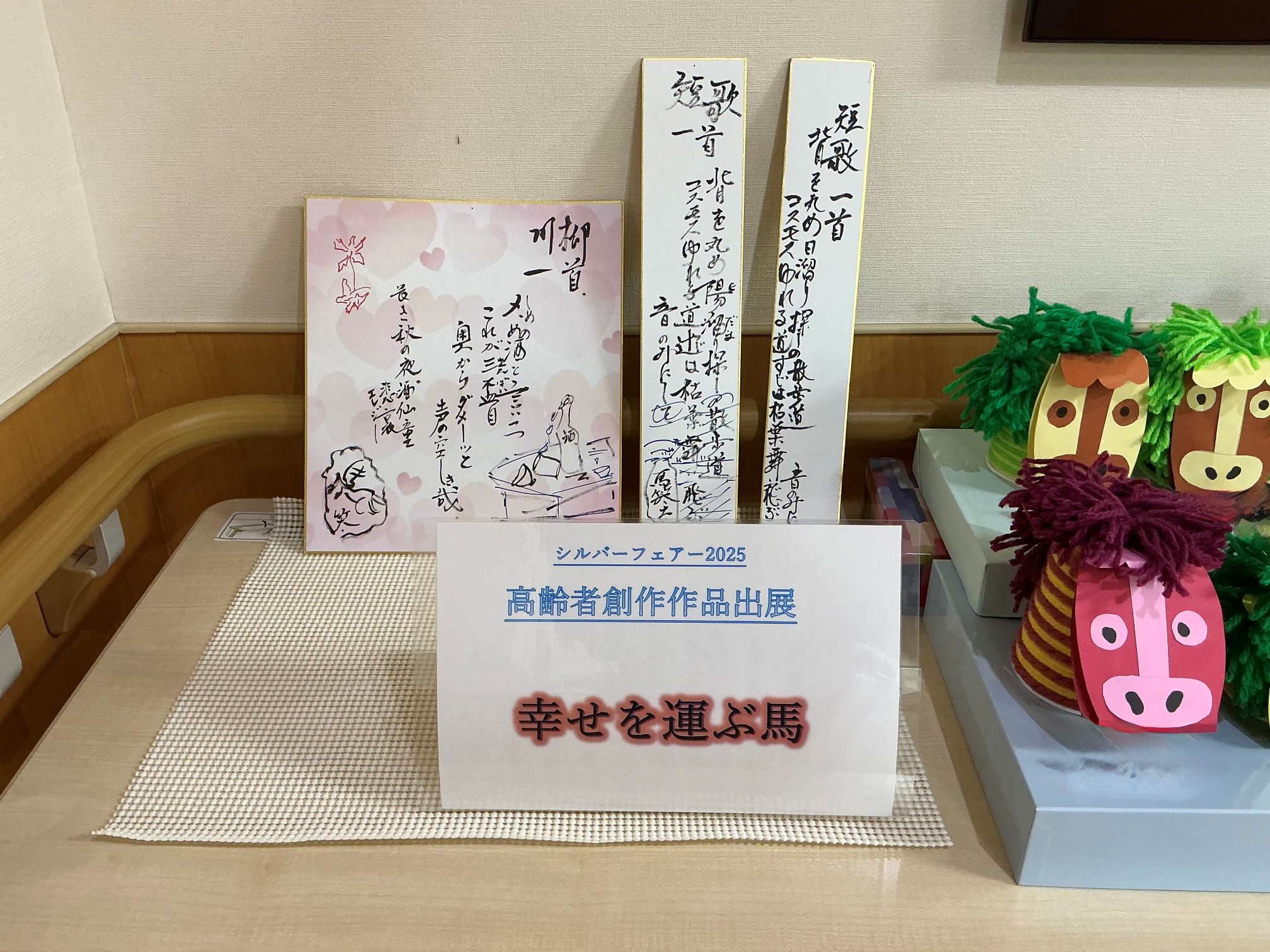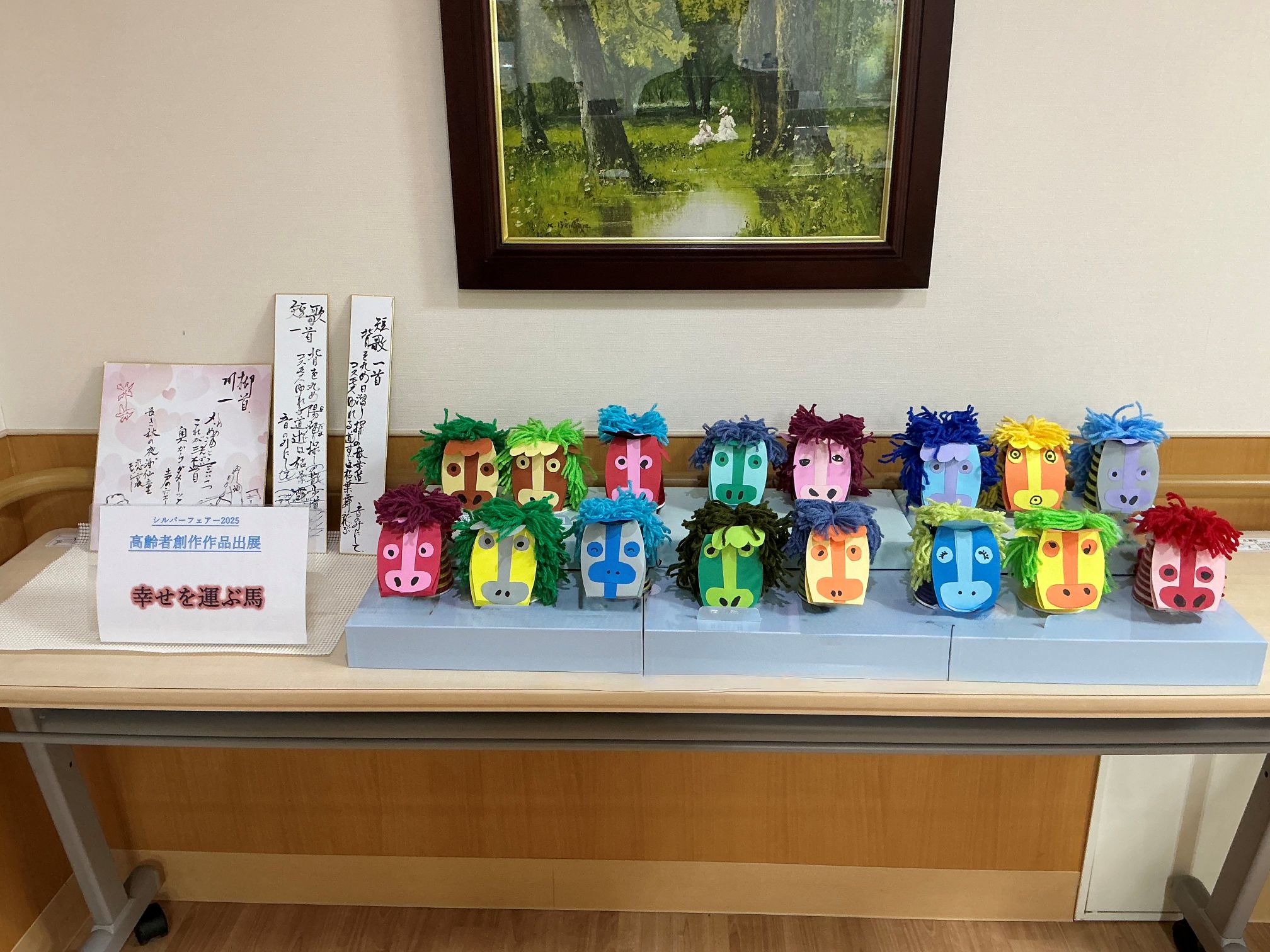 今回、施設ではシルバーフェア2025高齢者創作展へ出品させて頂きましたが、文化センターでの展示が終了し、利用者様に作って頂いた作品を受付前に展示させて頂いております☺